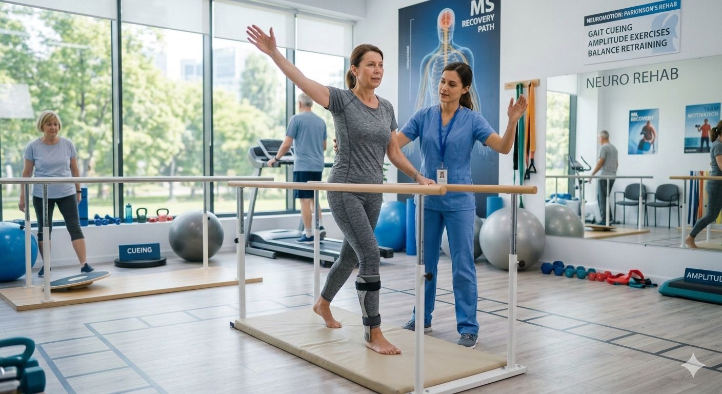 Physiotherapy for Parkinson’s disease aims to improve movement speed, balance, posture, and walking ability while reducing fall risk. At Neuromotion, therapy programs focus on amplitude-based exercises, gait training, cueing strategies, balance retraining, and functional mobility practice. Patients often experience stiffness, shuffling gait, and reduced arm swing, which are specifically targeted during sessions. Regular physiotherapy helps maintain mobility, improve coordination, and enhance overall physical function. Education on posture, home exercises, and fall prevention is also provided. Early and ongoing rehabilitation plays a key role in slowing functional decline and maintaining independence. Our structured, evidence-based approach supports patients in staying active, confident, and safe in their daily routines.